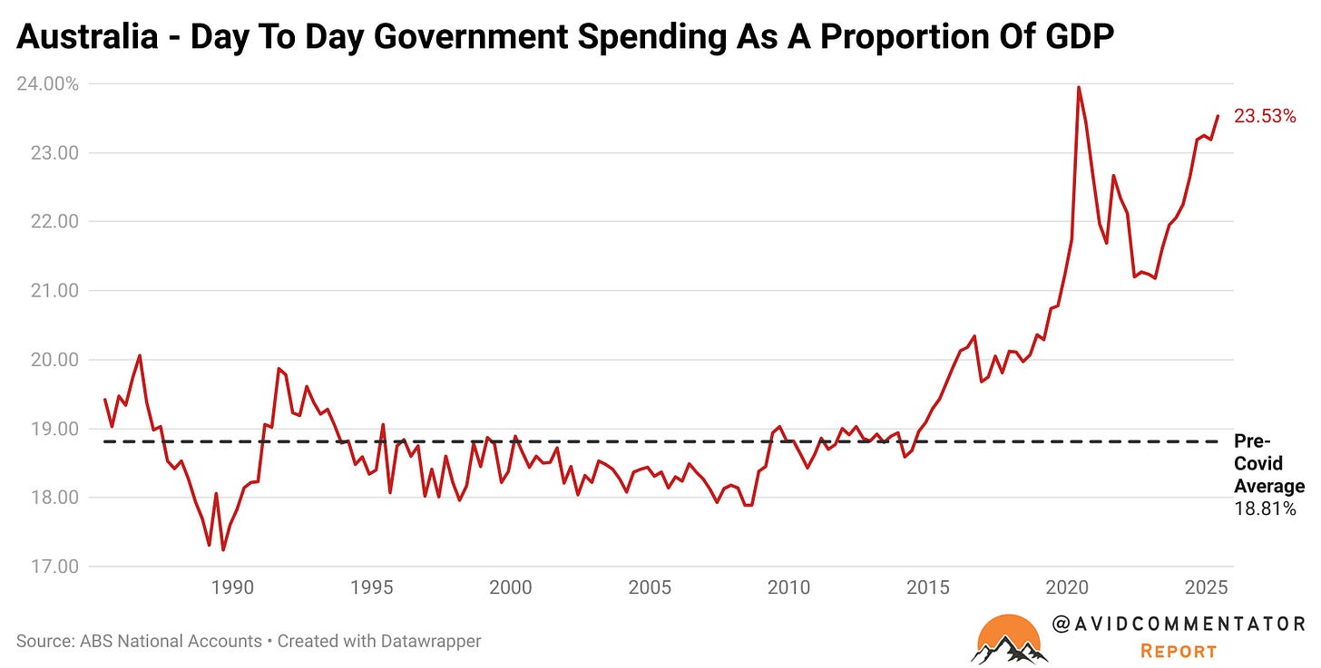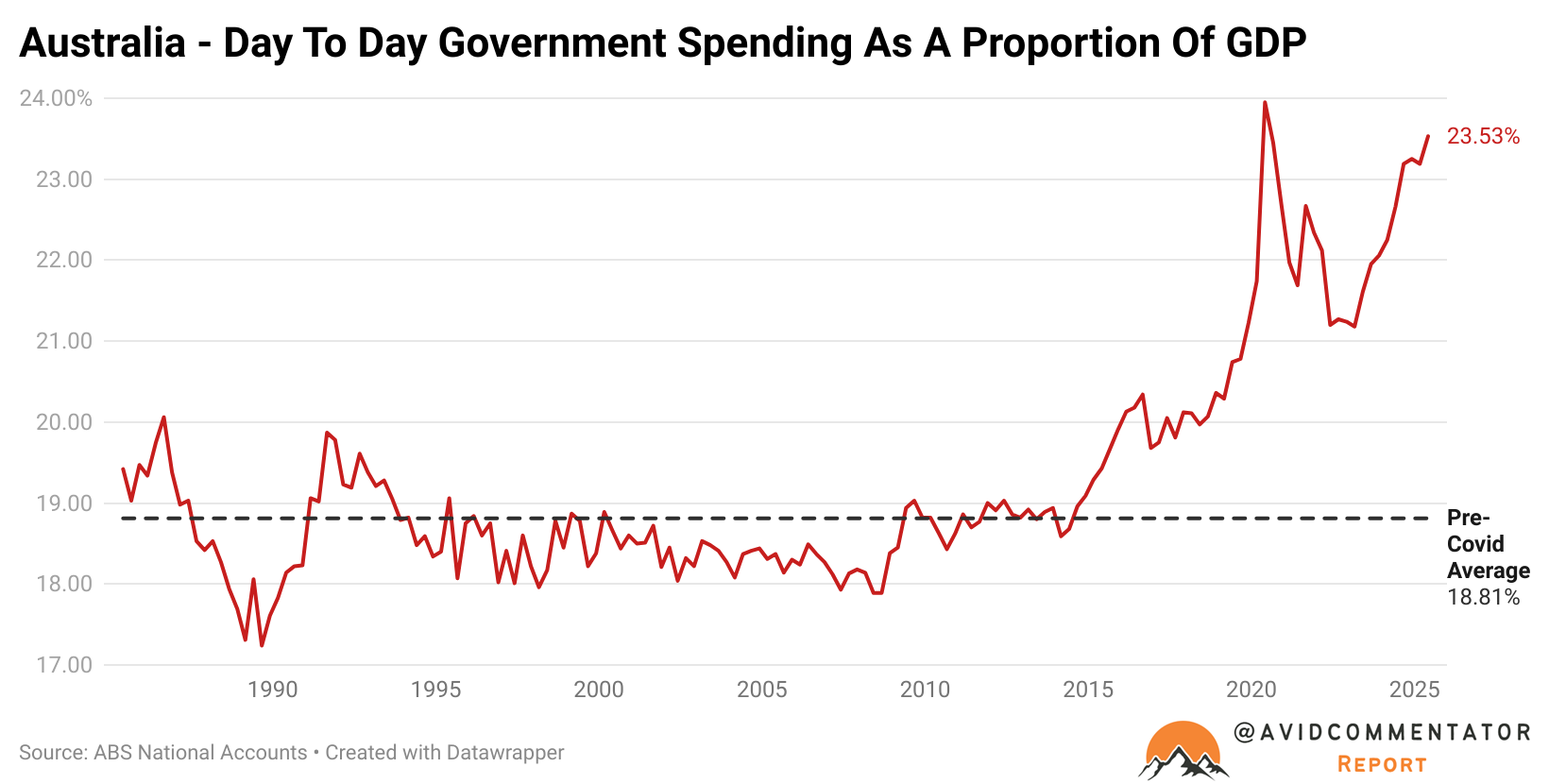 As of the latest data from the ABS, day to day government spending as a proportion of GDP is currently at it’s second highest level on record, eclipsed only by the height of the pandemic panic in June 2020.