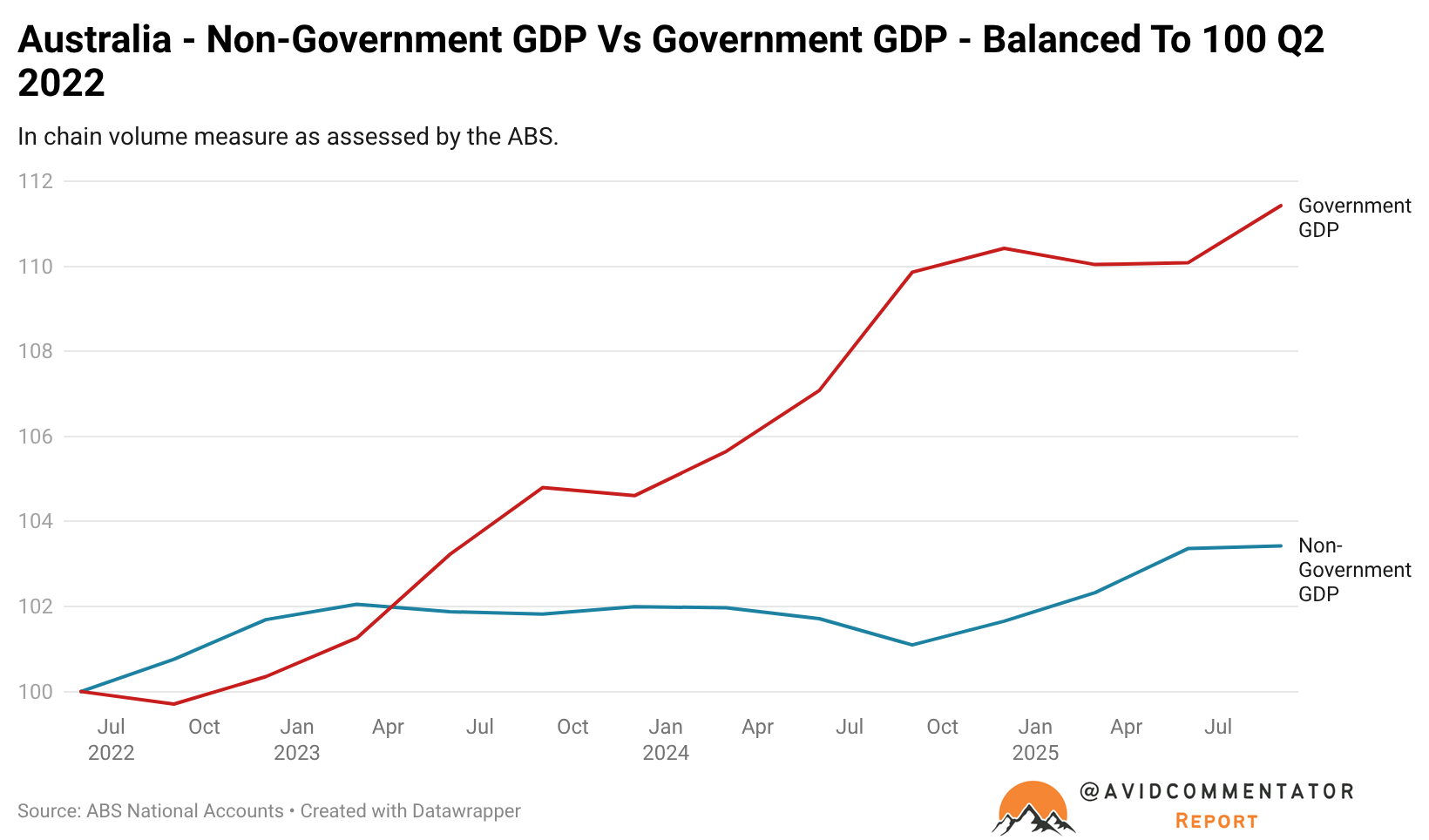 In terms of relative headline real growth since Q2 2022, government GDP has risen by 11.4%, while non-government GDP has risen by 3.4%.