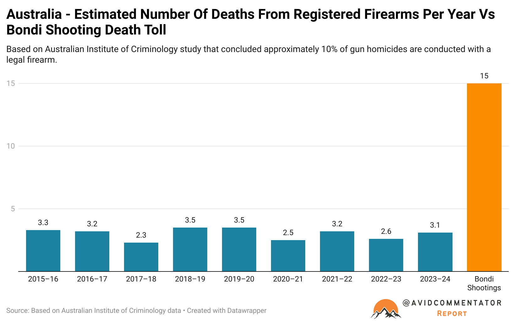 In short, Naveed Akram and Sajid Akram killed just as many people on the fateful day at Bondi Beach with a set of legally owned firearms as every single Australian did in the five years prior to that.