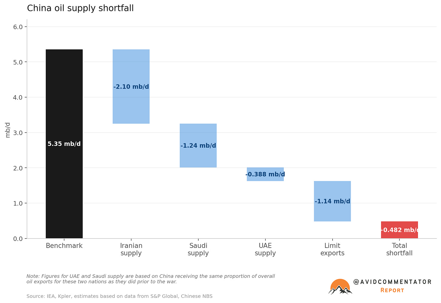 Put the Chinese export ban together with the aforementioned factors including continued Iranian exports that are higher now than pre-war and the ability to get existing contracted supplies rerouted to other ports, China’s shortfall of crude imports required for domestic consumption theoretically comes to under 500,000 barrels per day.