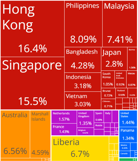 According to the 2024 BP Statistical Review, China exported approximately 1.14 million barrels per day of petroleum products, with the recipients by weight of value illustrated in the graph below.