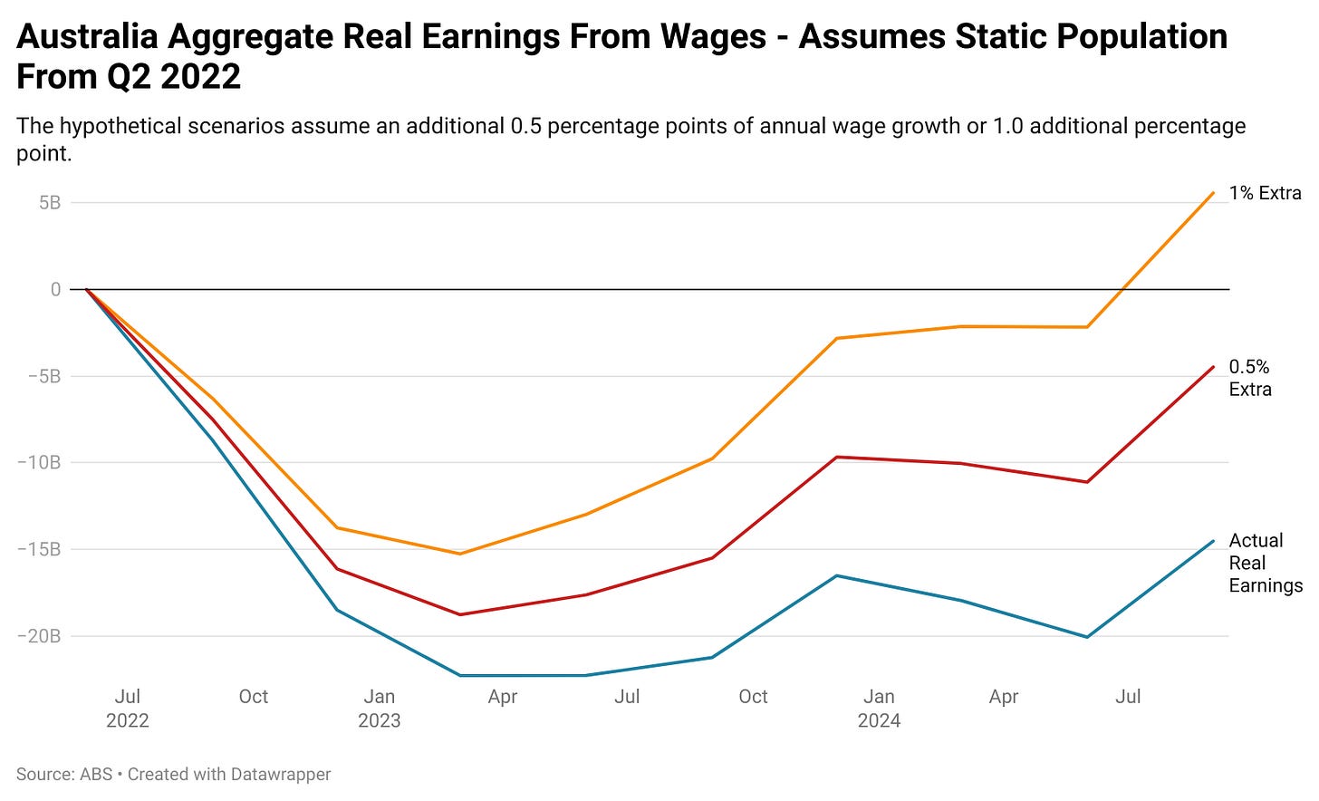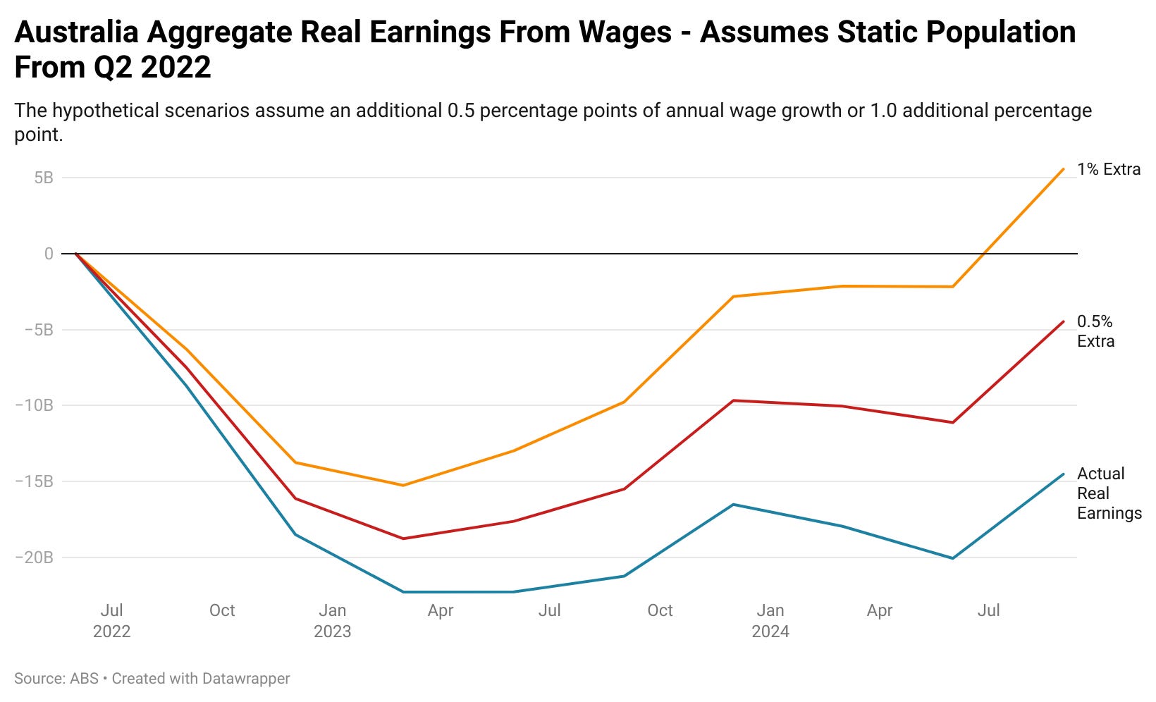 By adding an extra 0.5 percentage points in wages growth per year, total real wages compared with June 2022 would be down $4.5 billion. If we up that to an extra 1.0 percentage point in wages growth per year, the figure rises to a positive contribution of $5.6 billion per year.