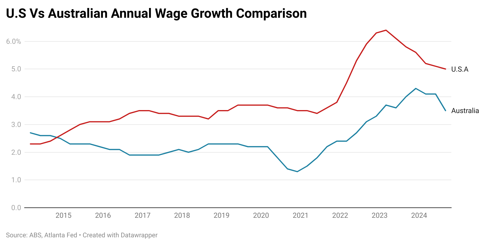 In reality, that didn’t come even close to coming to pass, with annual wages growth topping out at 4.3% in the December quarter of 2023, far below that of the United States or the U.K.