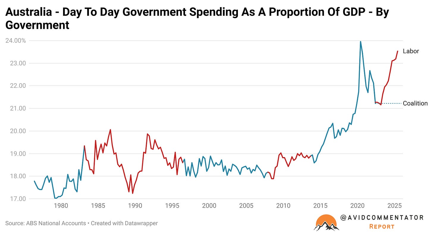 When the Albanese government came to power in May 2022, day to day government spending across all levels of government accounted for 21.2% of GDP.