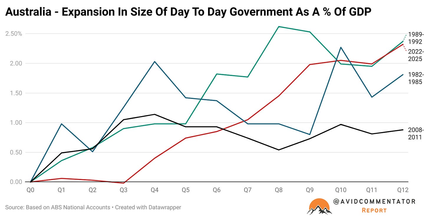 As you can see, the expansion of government as a proportion of GDP has been more than twice as large under business as usual for the Albanese government, as it was for the Rudd and later Gillard government during a major economic crisis.