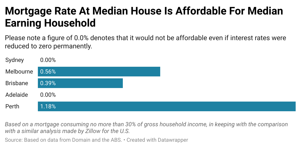 In Sydney and Adelaide, mortgage rates could fall dramatically and keep falling all the way to 0% before becoming affordable for the median earning household.