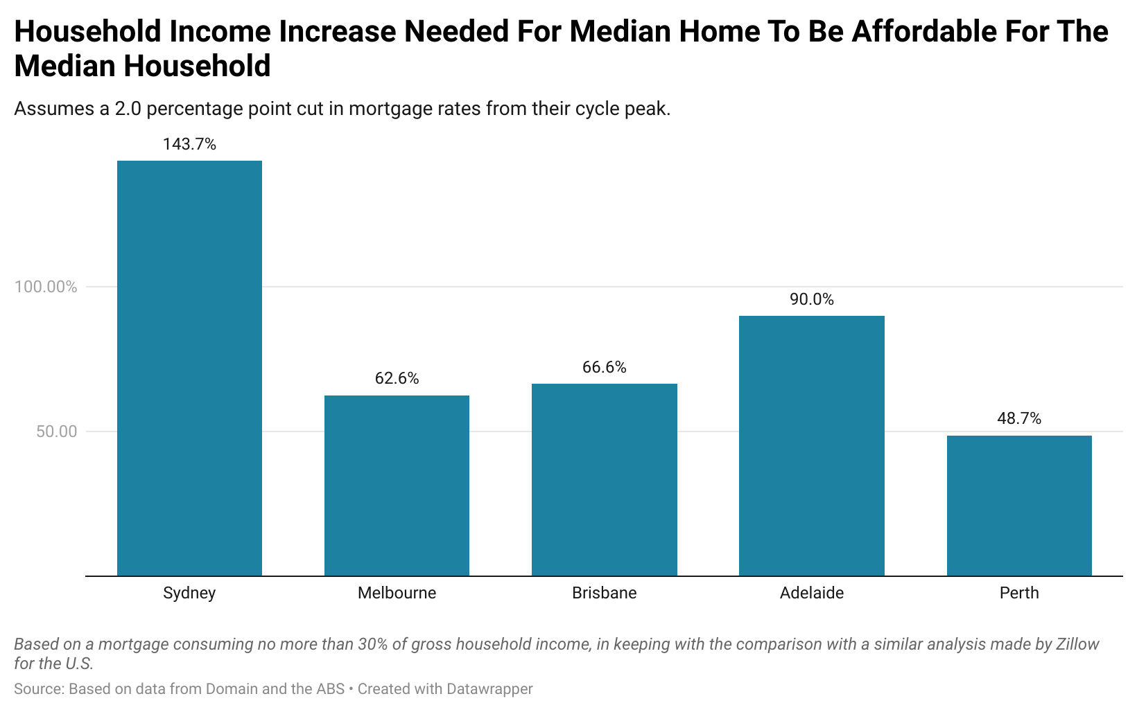 In Sydney, the worst performer of the bunch, an income 37.9% higher than the household median would be required in order to be able to afford the median house with zero interest rates.