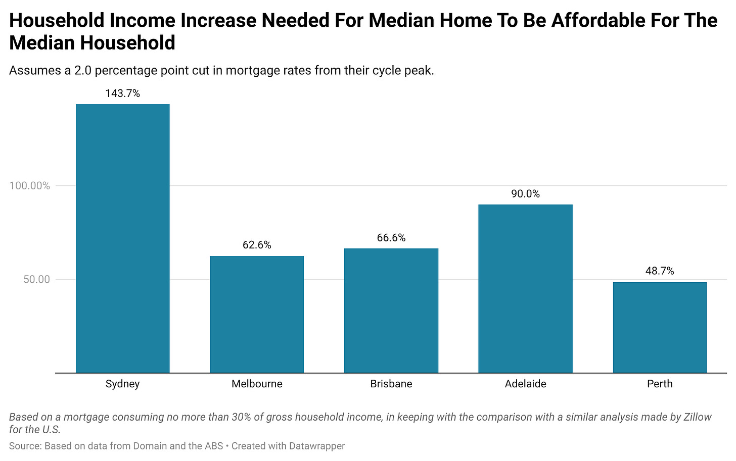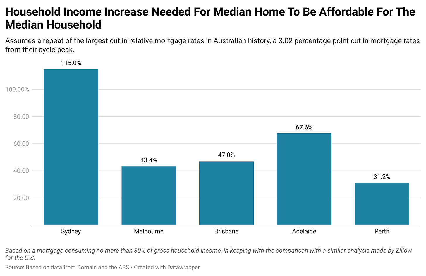 In Brisbane, household income would need to increase by 47%, in Adelaide by 64.6%, Melbourne by 43.4% and Perth by 31.2%.
