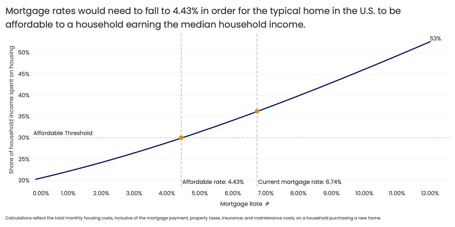 What it found was that U.S mortgage rates would need to fall to 4.43% for the typical U.S home to be affordable for a household on a median household income.